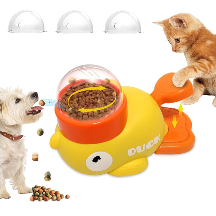 اسباب بازی پدالی تشویقی خور سگ و گربه بهترین گزینه برای سرگرمی پت شما بوده که طراحی چرخشی و تعاملی آن، ساعتها بازی لذتبخش را تضمین میکند. این اسباب بازی مدل اردک دارای سه سری مجزا برای انواع تشویقی ها بوده و با فشردن دسته توسط حیوان تشویقیها به بیرون پرتاب میشوند.