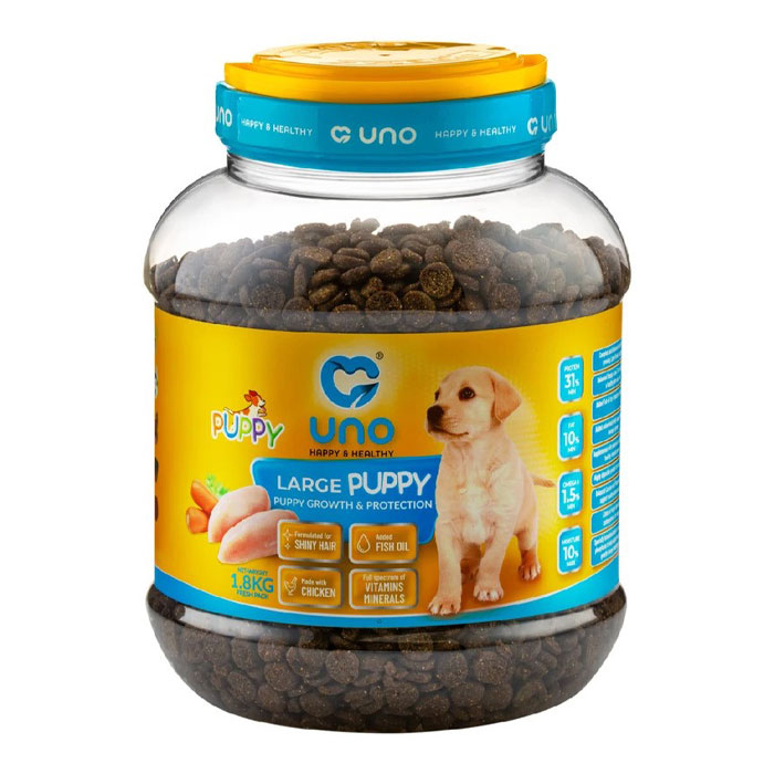 غذای خشک توله سگ نژاد بزرگ کیلویی اونو UNO یک غذای بسیار خوش خوراک با 31% پروتئین خالص آزمایش شده است. کلیه محصولات اونو حاوی سری کامل ویتامین ها و مواد معدنی تامین شده از BASF آلمان، DSM هلند و Adisseo فرانسه میباشند. این غذا کلیه ویتامین ها و مواد معدنی مورد نیاز رشد توله سگ شما را تامین میکند و نیازی به مکمل اضافی ندارید.
