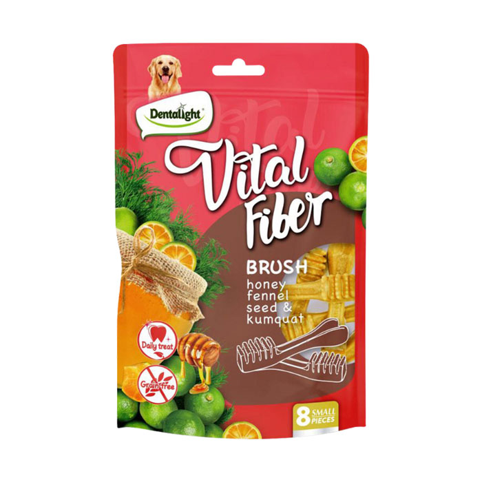 تشویقی دنتال اسنک میوه ای مسواکی با طعم کامکوات و عسل سایز کوچک دنتالایت با ترکیبات ترکیبی میوه و سبزیجات بدون غلات برای سلامت عمومی و تقویت دستگاه گوارش سگ شما مناسب است. تراکم و فیبر بالای این تشویقی به جلا دادن دندان سگ کمک میکند و پلاکتهای دندانی آن را از بین میبرد و همچنین به شما این امکان را میدهد دندان سگ خود را به روشی آسان مسواک بزنید.