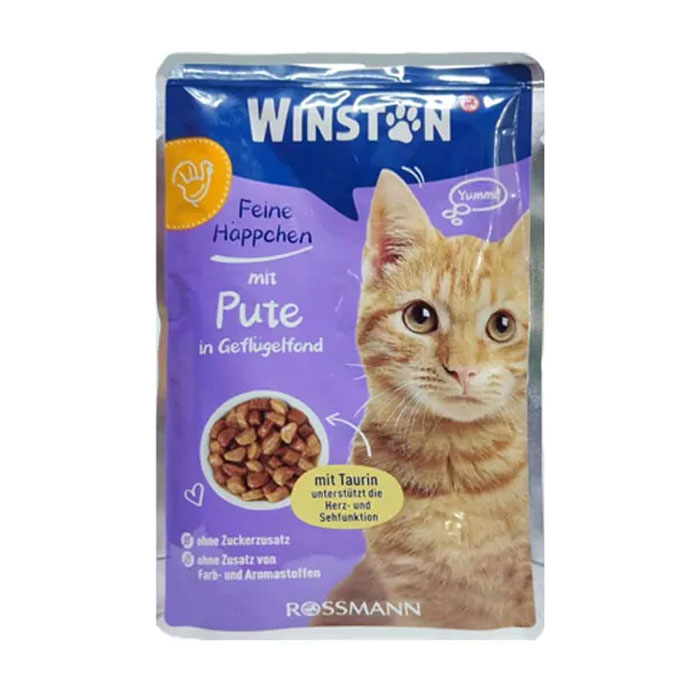 سوپ گربه وینستون حاوی تکه های بوقلمون است که بسیار لذیذ می‌باشد. فرمولاسیون این غذا فاقد قند اضافی و رنگ های مصنوعی بوده و سرشار از بیوتین است که برای ایجاد تنوع در تغذیه گربه ها می‌توان از این پوچ استفاده کرد و برای تمامی نژادهای گربه مناسب است.